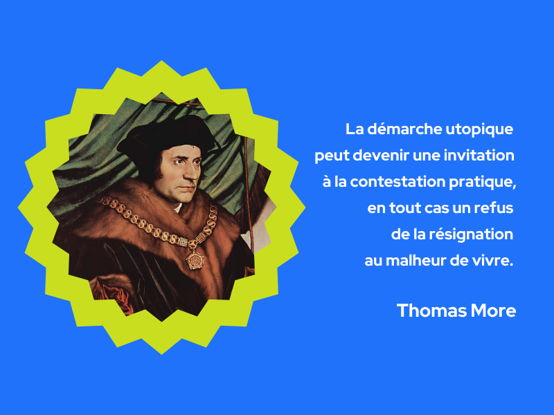 Ce mot est apparu pour la première fois en 1516 dans l’ouvrage de Thomas More Utopia, un écrit fictif qui met en scène la République d’Utopie. Dans la première partie du livre, il critique entre autres les guerres incessantes, le despotisme du pouvoir politique, la soif de luxe des privilégiés et des puissants, l’injustice et la propriété privée. Puis dans la seconde partie, il embarque son lectorat sur son île imaginaire d’Utopie : une République plus égalitaire et juste que l’Europe du XVIe siècle dans laquelle l’auteur évolue. Son histoire critique ouvertement les injustices et aberrations de son temps et propose en miroir le récit d’une société construite sur un modèle de bonheur, de sagesse et de justice sociale dont pourraient s’inspirer les Européen·es de l’époque. Son livre s’appuie sur un récit certes imaginaire mais non moins irréalisable par les instances politiques.